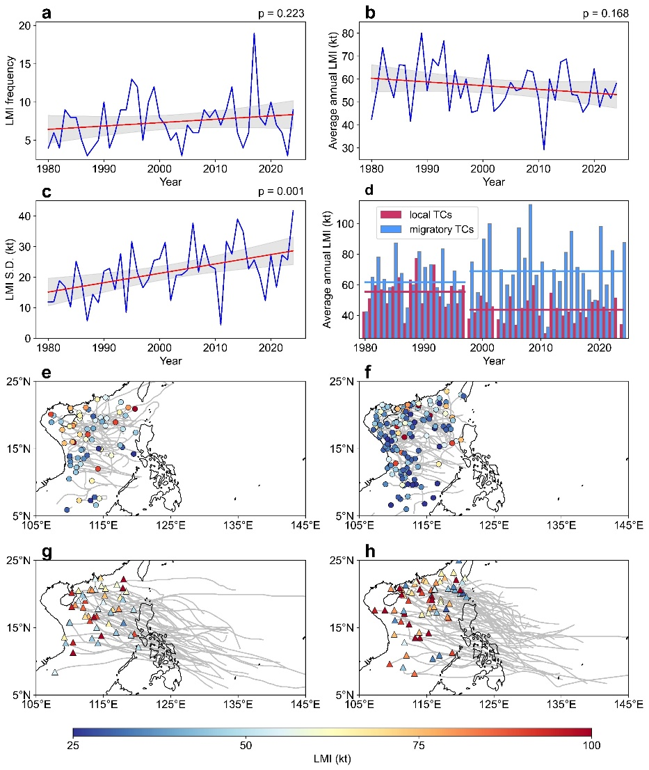 2025年11月25日,海洋气象研究院徐建军教授团队在地球科学领域国际学术期刊《Geophysical Research Letters》上发表题为“Increasing Variability in Tropical Cyclone Lifetime Maximum Intensity Over the South China Sea”的研究论文。该成果由广东海洋大学硕士研究生黄佩兰担任第一作者,梁梅副教授与涂石飞教授为通讯作者,徐建军教授及中山大学胡湛教授参与合作研究,在南海热带气旋(台风)最大生命强度(LMI)变化机制研究领域取得重要突破。