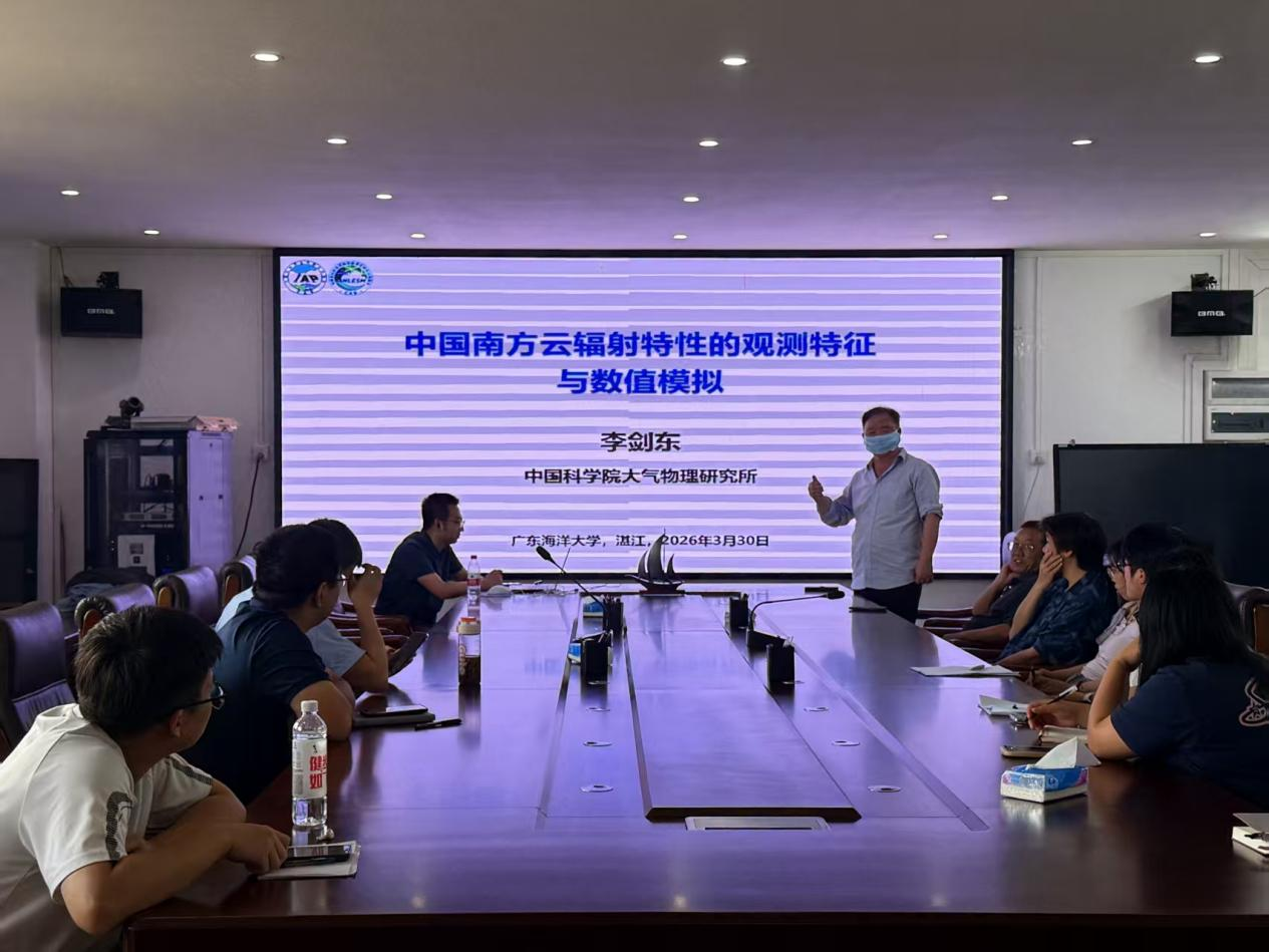 2026年3月30日下午,开元游戏 在海科楼505会议室举办了2026年第12期“海学讲堂”。本期活动邀请了中国科开元 大气物理研究所地球系统数值模拟与应用全国重点实验室项目研究员李剑东,为师生作了题为“中国南方云辐射特性的观测特征与数值模拟”的学术报告。开元 教师及二十余名研究生、本科生共同参与了此次活动。